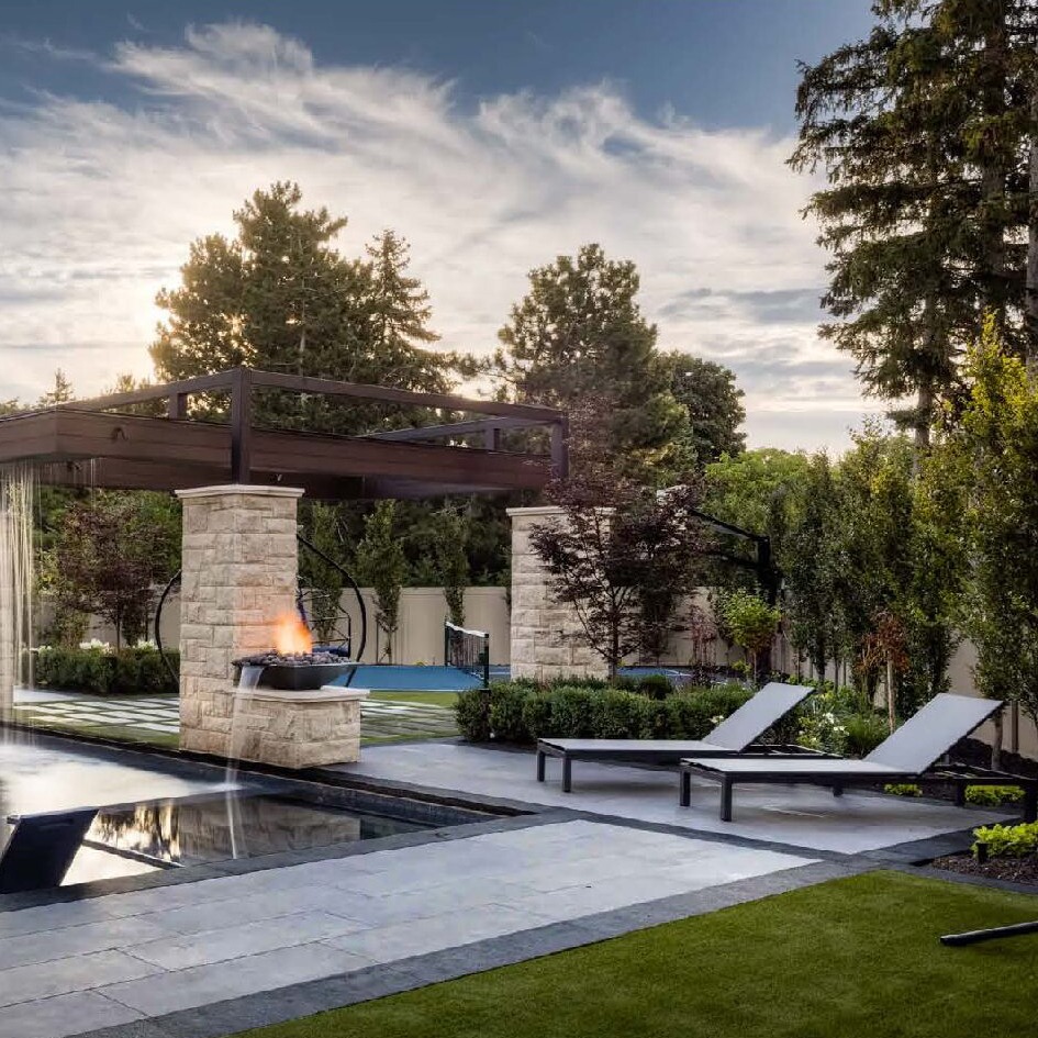 Outdoor patio with modern stone fire pit and gray sectional sofa. Surrounded by trees and overcast sky, creating a cozy, inviting atmosphere.